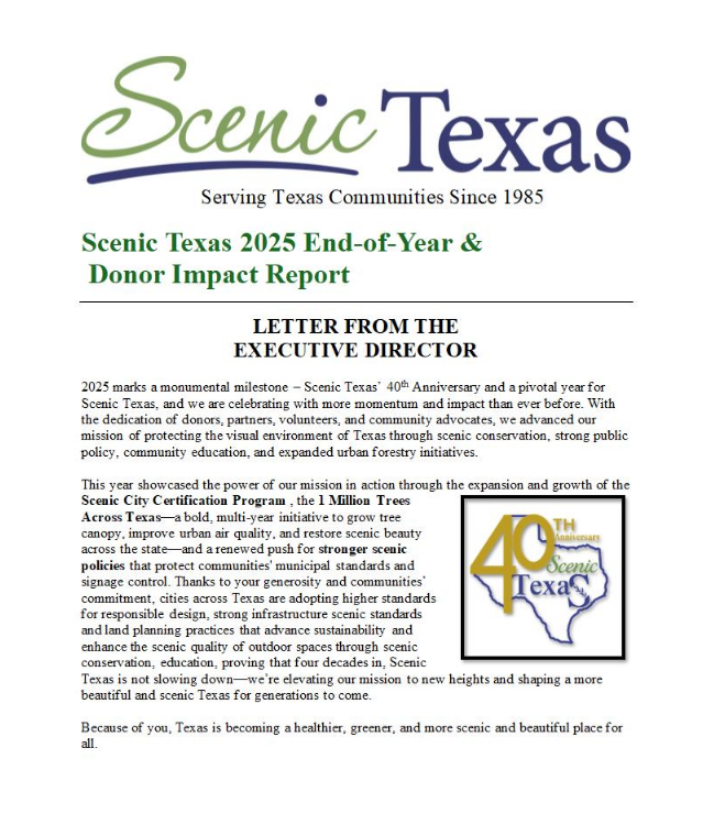 Scenic Texas supports communities and citizens who believe in the importance of preserving and protecting Texas’ scenic beauty. We provide advocacy, resources, support, and guidance to communities and municipalities faced with scenic conservation challenges.